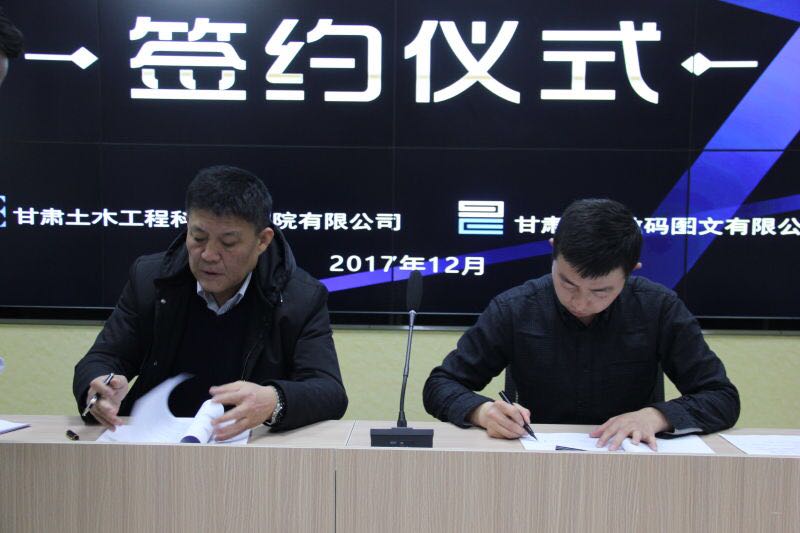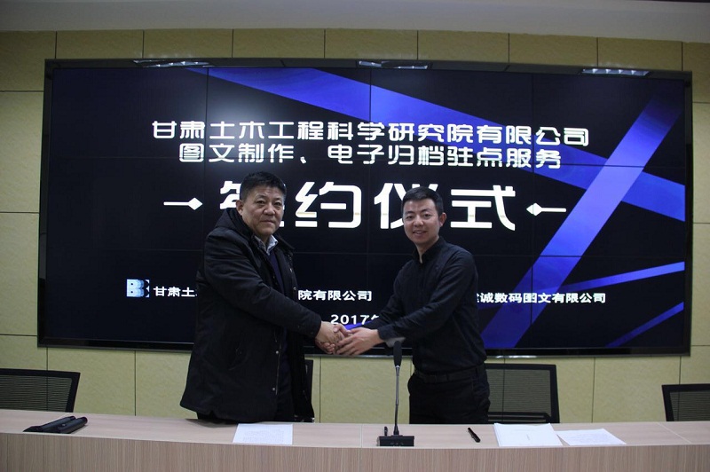 2017年12月19日鄭建軍副院長與甘肅建誠數(shù)碼圖文有限公司負(fù)責(zé)人在我公司學(xué)術(shù)報(bào)告會(huì)議廳共同簽署了《圖文制作、電子歸檔駐點(diǎn)服務(wù)》合同。