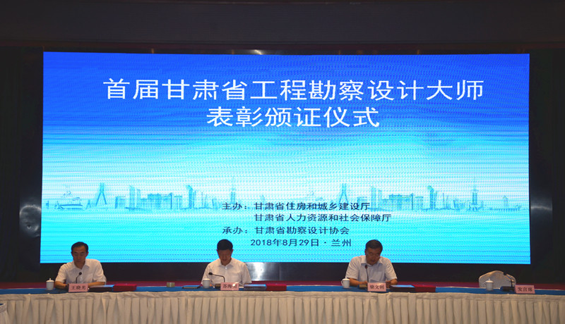 2018年8月29日上午,全省勘察設(shè)計(jì)行業(yè)發(fā)展座談會(huì)暨首屆甘肅省工程勘察設(shè)計(jì)大師表彰頒證儀式在組工大廈舉行,表彰12名全省首屆工程勘察設(shè)計(jì)大師,并就勘察設(shè)計(jì)行業(yè)的發(fā)展方向和思路進(jìn)行了交流探討。在頒證儀式上,我公司董事長、黨委書記章海峰同志獲“甘肅省工程勘察設(shè)計(jì)大師”榮譽(yù)稱號,并獲頒獎(jiǎng)狀獎(jiǎng)牌。