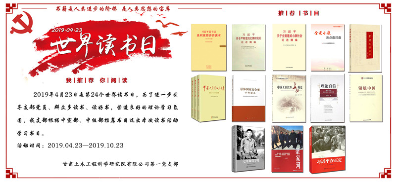 2019年4月23日適逢第24個(gè)世界讀書日,為了進(jìn)一步引導(dǎo)支部黨員、群眾多讀書、讀好書,營造良好的理論學(xué)習(xí)氛圍,我支部根據(jù)中宣部、中組部推薦書目選出本次讀書活動學(xué)習(xí)書目。