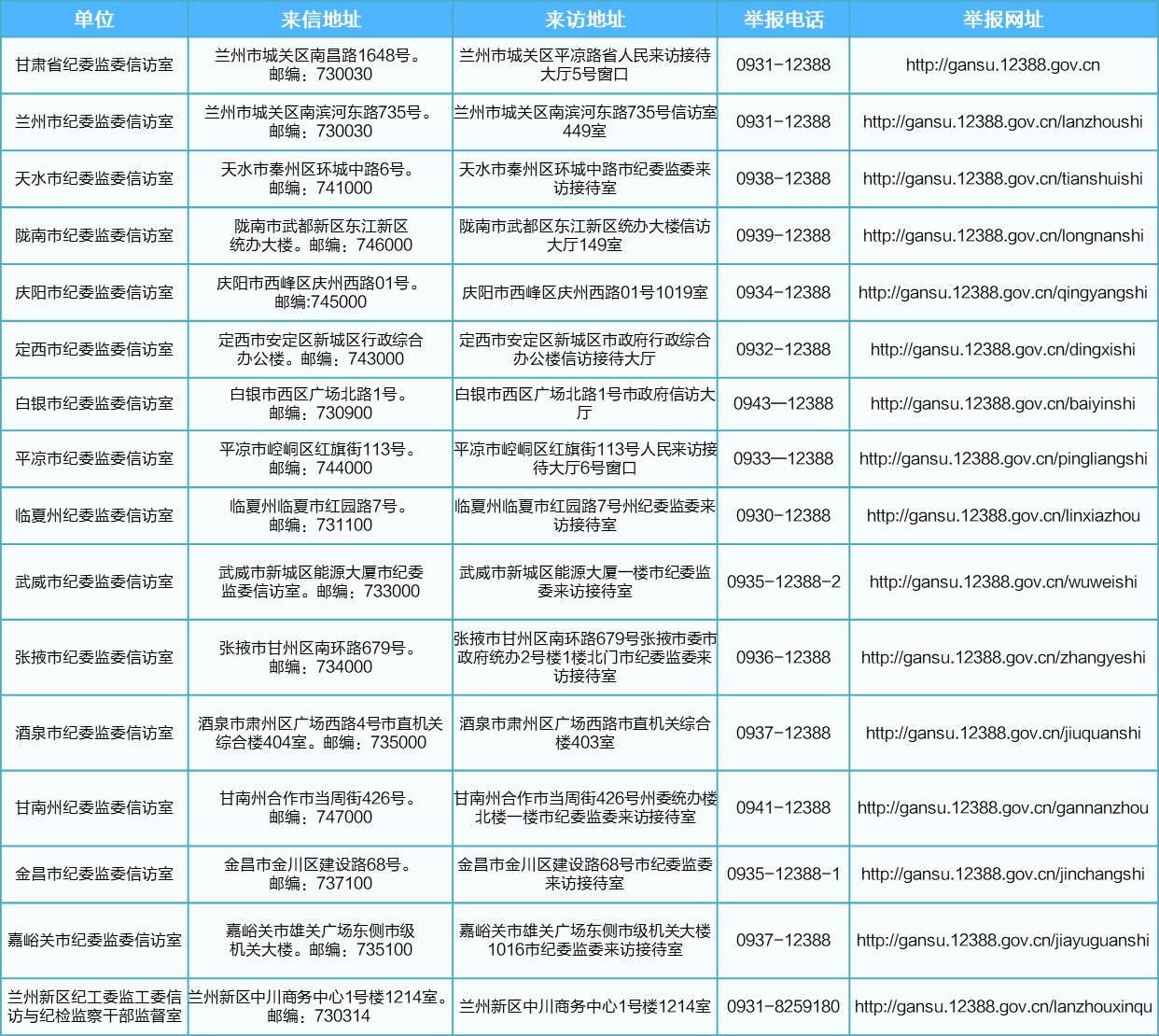 為了最大限度方便您舉報(bào),甘肅省紀(jì)檢監(jiān)察機(jī)關(guān)傾力打造了“信、訪、電、網(wǎng)”四種舉報(bào)渠道。