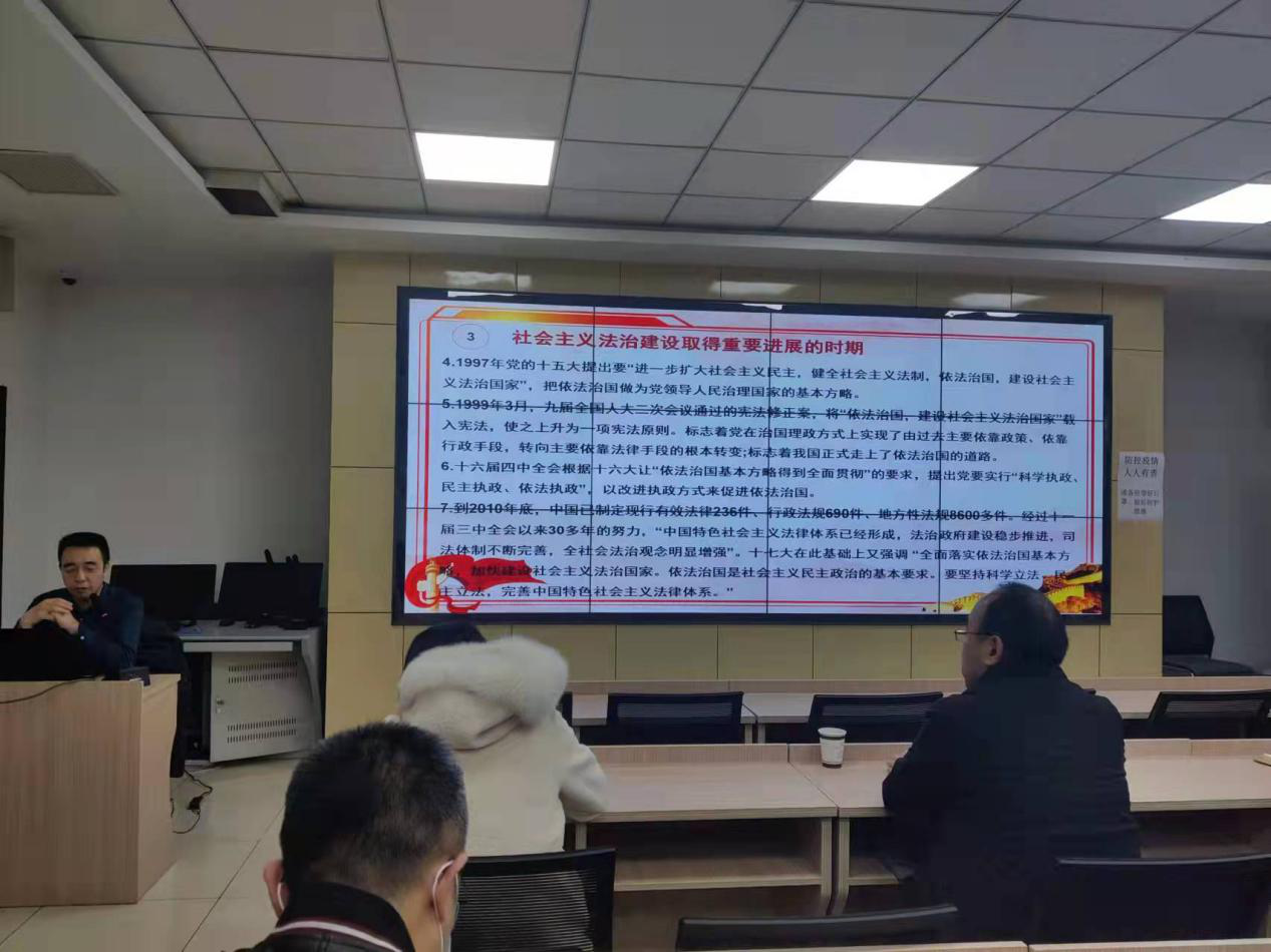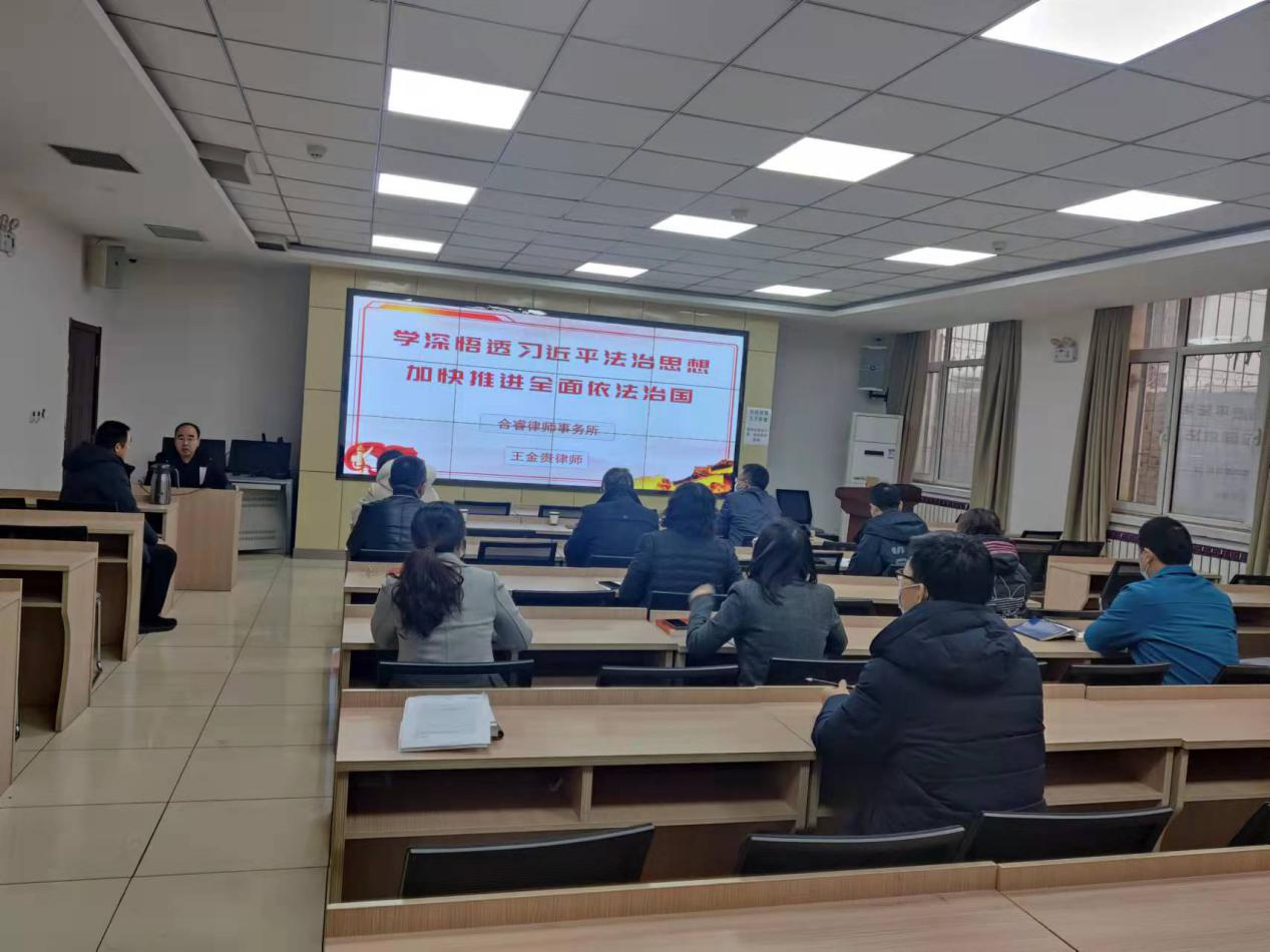 會議邀請了合睿律師事務(wù)所王金貴律師作《學(xué)深悟透習(xí)近平法治思想》的專題輔導(dǎo)講授。王金貴律師以依法治國探索的開端為切入點,以黨的法治建設(shè)歷史為主線,結(jié)合自身的切身體會,深入淺出的對習(xí)近平法治思想的形成作了全面深入的解讀,習(xí)近平法治思想從歷史和現(xiàn)實貫通、國內(nèi)和國際關(guān)聯(lián)、理論和實踐相結(jié)合上,深刻回答了新時代為什么實行全面依法治國、怎樣實行全面依法治國等一系列重大問題。
