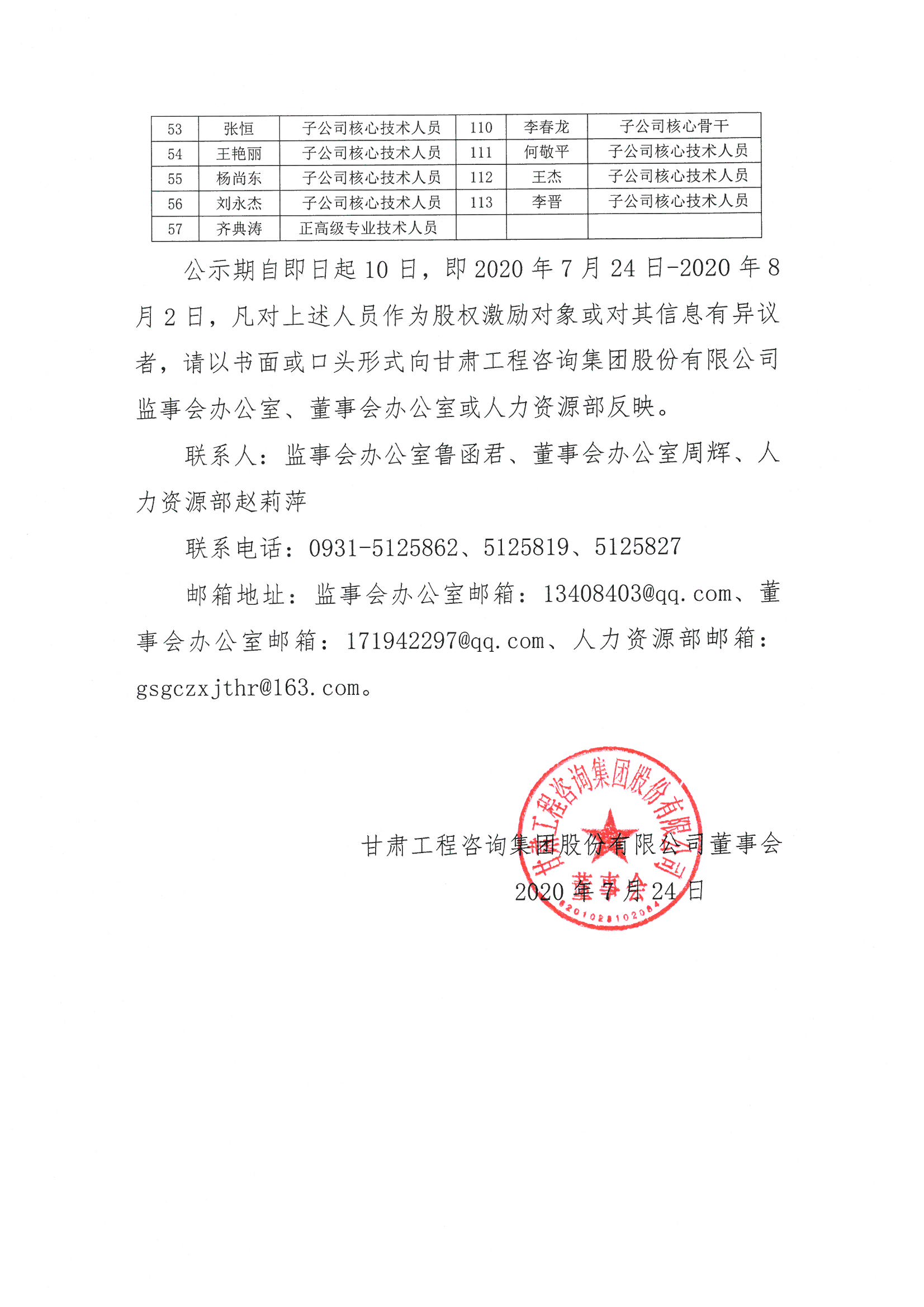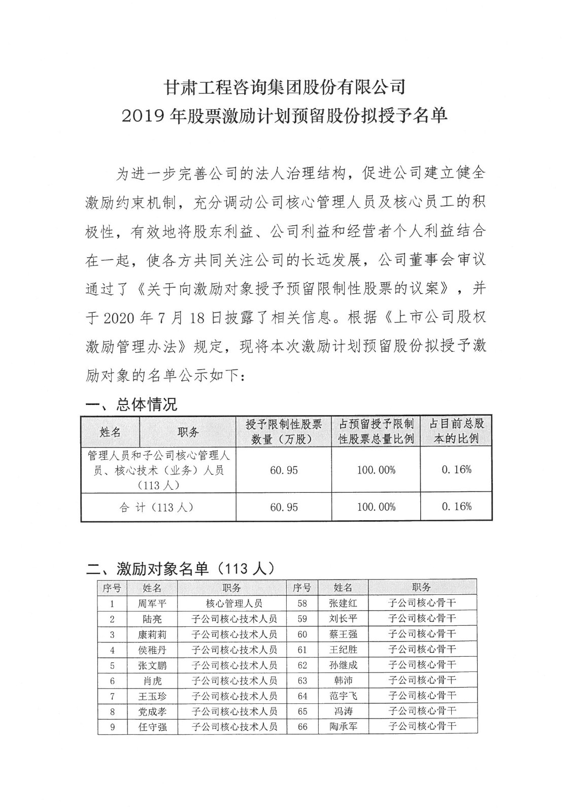 甘肅工程咨詢集團(tuán)股份有限公司2019年股票激勵(lì)計(jì)劃預(yù)留股份擬授予名單