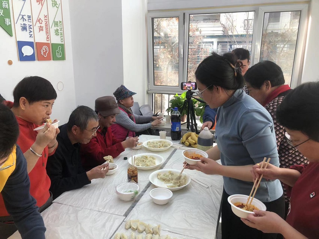 活動中,11名居民群眾、社區(qū)工作人員和集團公司志愿者們一起切菜剁餡,一起包餃子、煮餃子,忙得不亦樂乎。當熱騰騰的餃子端上桌,大家圍桌而坐,共享香噴噴的餃子,感受著濃厚的節(jié)日氛圍。