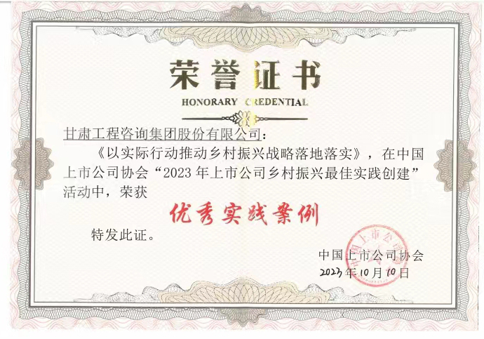 近日,在中國(guó)上市公司協(xié)會(huì)主辦的上市公司鄉(xiāng)村振興經(jīng)驗(yàn)交流會(huì)暨最佳實(shí)踐案例發(fā)布會(huì)上,由甘肅工程咨詢(xún)集團(tuán)申報(bào)的鄉(xiāng)村振興實(shí)施案例榮獲“優(yōu)秀實(shí)踐案例”。
