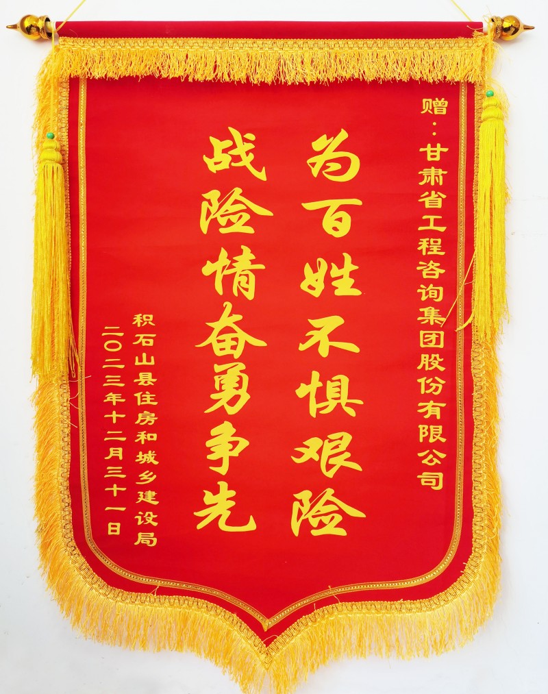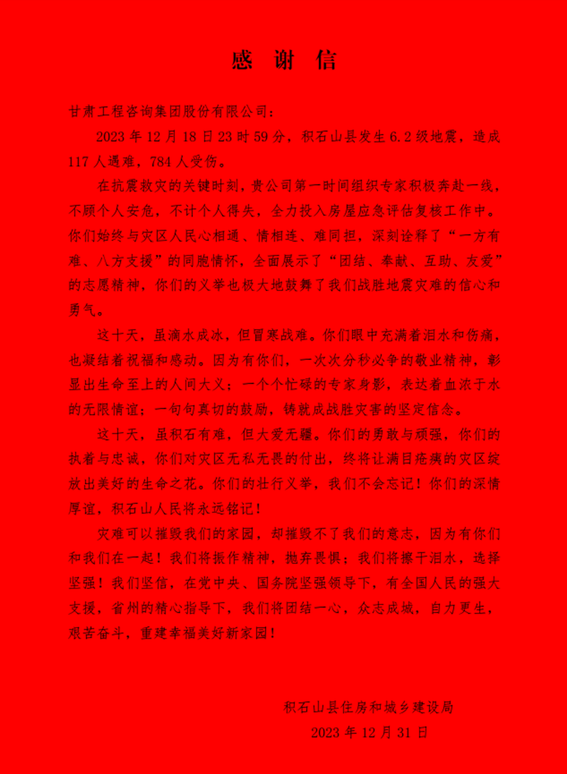 1月3日上午,積石山縣住房和城鄉(xiāng)建設(shè)局向甘肅工程咨詢集團(tuán)贈(zèng)送“為百姓不懼艱險(xiǎn),戰(zhàn)險(xiǎn)情奮勇爭(zhēng)先”錦旗,并發(fā)來(lái)《感謝信》,對(duì)在抗震救災(zāi)關(guān)鍵時(shí)刻奔赴災(zāi)區(qū)開展房屋應(yīng)急評(píng)估工作的專家表達(dá)感謝和敬意。