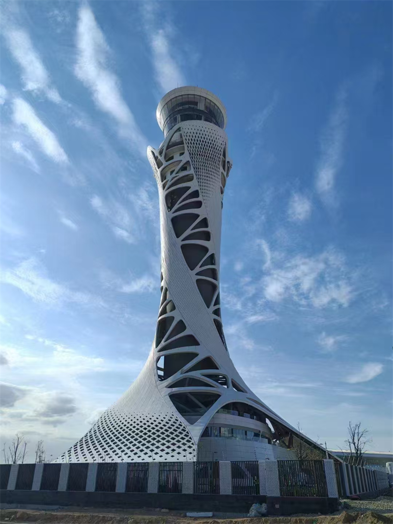 項目總投資13.43億元,塔臺建筑高度99.9米,是全國空管分局有史以來建設規(guī)模最大、投資最大的空管建設項目,創(chuàng)造了多項分局站建設第一。項目總體以“敦煌飛天”與“絲綢之路”為靈感,塔臺采用鋼結(jié)構(gòu)斜交網(wǎng)格外框+鋼筋混凝土核心筒設計,空管工作區(qū)采用鋼筋混凝土框架+首層BRB支撐+基礎橡膠隔震支座設計,鋼結(jié)構(gòu)總量達3561噸。