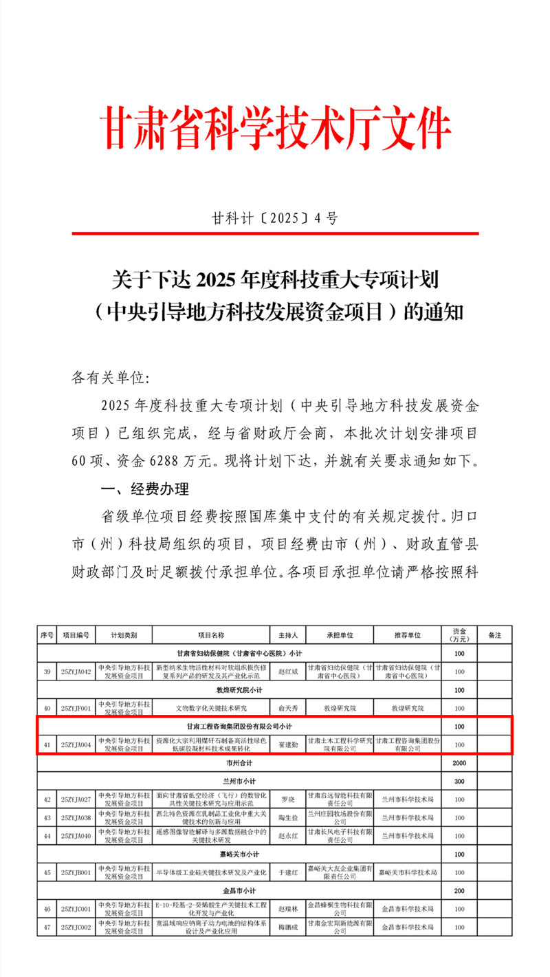 近日,甘肅省科技廳公布了2025年度科技重大專項計劃(中央引導(dǎo)地方科技發(fā)展資金項目)立項名單,甘肅工程咨詢集團(tuán)土木工程院主持申報的“資源化大宗利用煤矸石制備高活性綠色低碳膠凝材料技術(shù)成果轉(zhuǎn)化”項目成功立項。