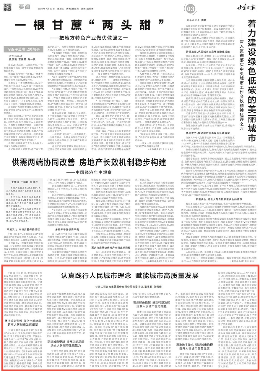 7月14日至15日,中央城市工作會(huì)議在北京舉行。這是時(shí)隔十年,黨中央再次召開的城市工作會(huì)議,為新時(shí)代新征程城市工作指明方向。甘肅工程咨詢集團(tuán)深入學(xué)習(xí)貫徹習(xí)近平總書記關(guān)于城市工作的重要論述,全面落實(shí)中央城市工作會(huì)議精神,認(rèn)真踐行人民城市理念,立足區(qū)域發(fā)展實(shí)際,將集團(tuán)公司七十余年技術(shù)積淀轉(zhuǎn)化為服務(wù)人民需求的實(shí)踐動(dòng)能,在優(yōu)化城市空間格局、提升城市功能品質(zhì)、推動(dòng)綠色低碳轉(zhuǎn)型、賦能智慧高效治理等領(lǐng)域精耕細(xì)作,助推全省城市建設(shè)向著高度與溫度并存、發(fā)展與惠民同步的方向邁進(jìn)。