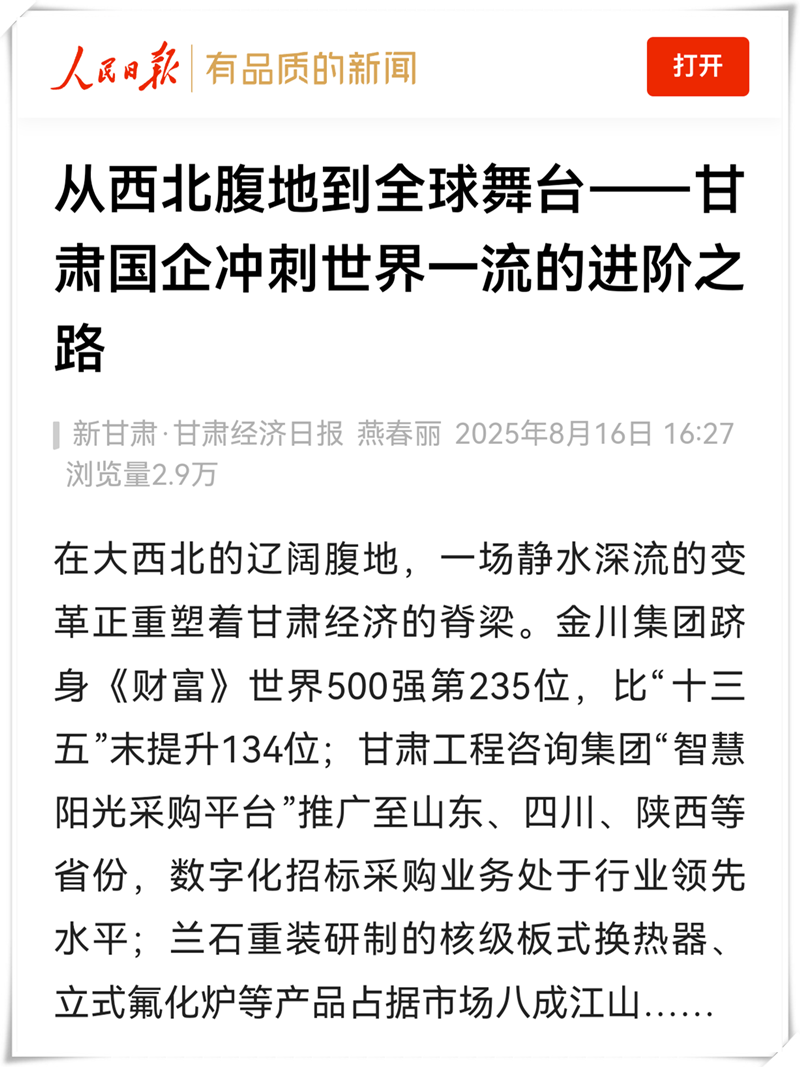 人民日報客戶端報道丨從西北腹地到全球舞臺——甘肅國企沖刺世界一流的進階之路