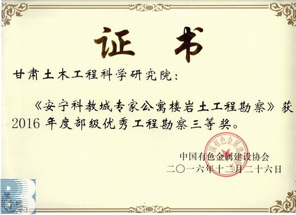 《安寧科教城專家公寓樓巖土工程勘察》(2016年度部級優(yōu)秀工程勘察三等獎)