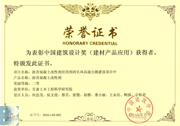 《瀝青混凝土改性劑應(yīng)用到西長(zhǎng)鳳高速公路建設(shè)項(xiàng)目中》(2016年度中國(guó)建筑設(shè)計(jì)建材產(chǎn)品應(yīng)用二等獎(jiǎng))