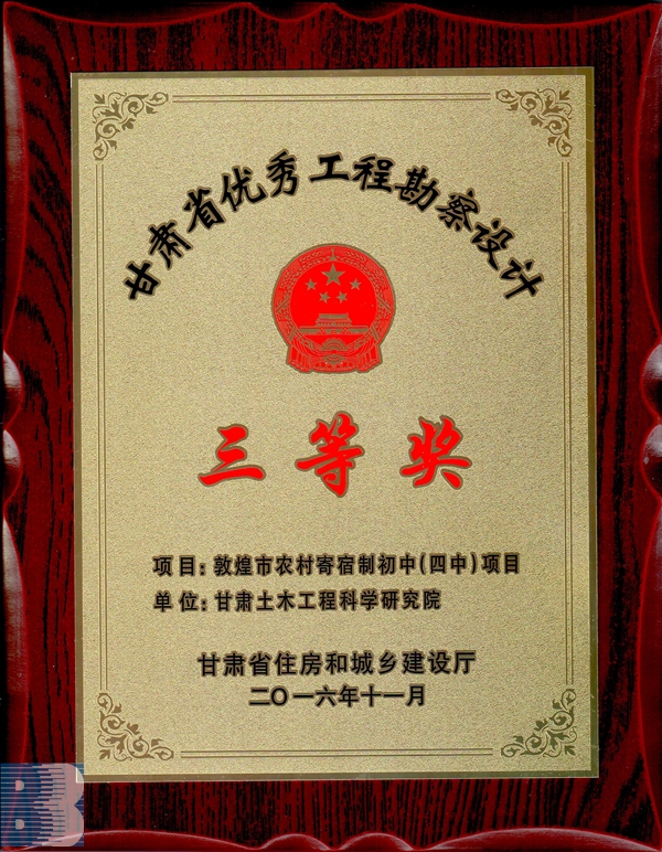 《敦煌市農(nóng)村寄宿制初中(四中)項(xiàng)目》(2016年度甘肅省優(yōu)秀工程勘察設(shè)計(jì)三等獎(jiǎng))