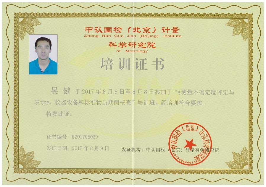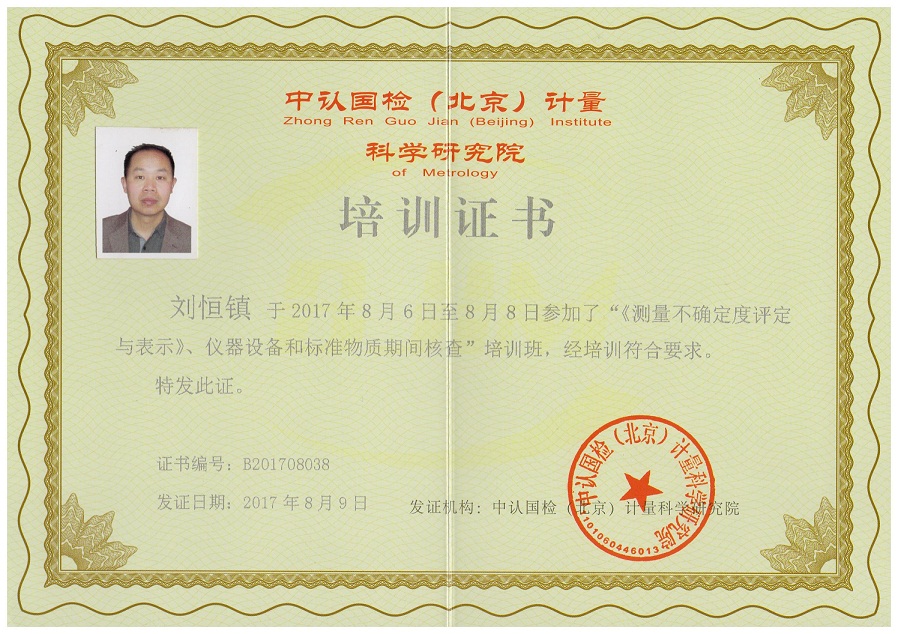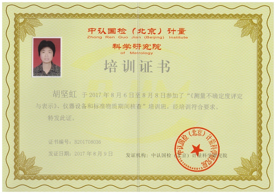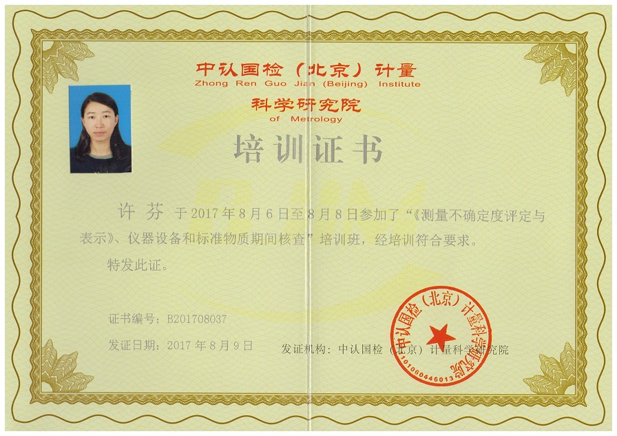 為了加強我院的測量不確定度及標(biāo)準(zhǔn)物質(zhì)期間核查的能力,我院選派了胡堅虹、劉恒鎮(zhèn)、吳健、許芬四位技術(shù)人員參加了于2017年8月6日在廈門八山酒店開展的“新版《測量不確定度評價與表示》、儀器設(shè)備和標(biāo)準(zhǔn)物質(zhì)期間核查”的培訓(xùn)學(xué)習(xí),培訓(xùn)為期三天,并獲得了由中認(rèn)國檢(北京)計量科學(xué)研究院頒發(fā)的培訓(xùn)證書。